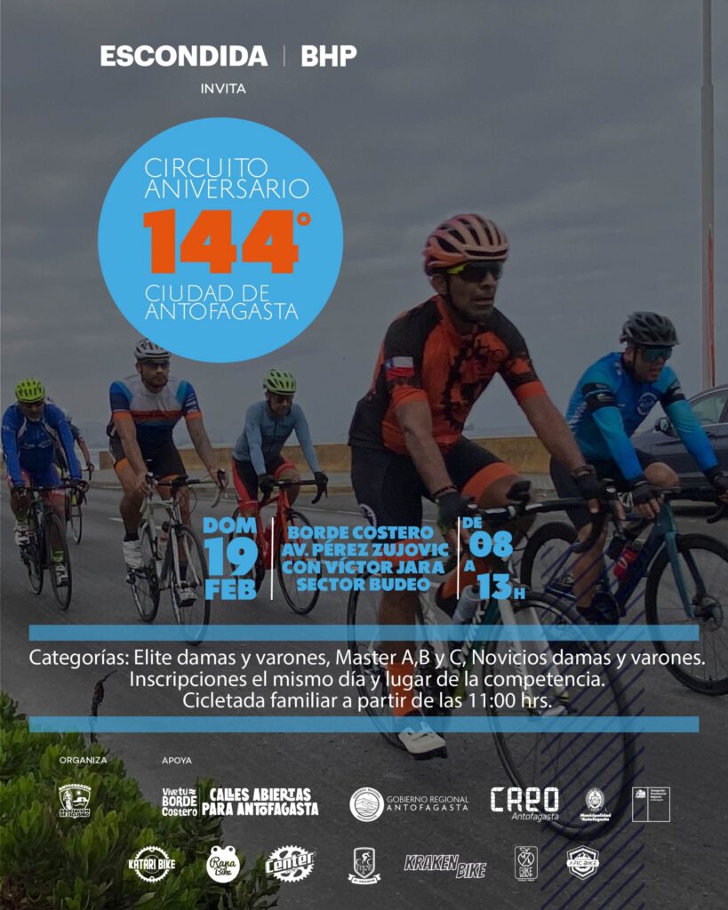 Una nueva fecha de ciclismo de competición es lo que se vivirá este domingo 19 de febrero a partir de las 9.00 de la mañana, con el tradicional “Circuito Aniversario 144° Ciudad de Antofagasta”. Evento deportivo realizado en el marco de la celebración de un nuevo año de la comuna que reunirá a representantes del norte.